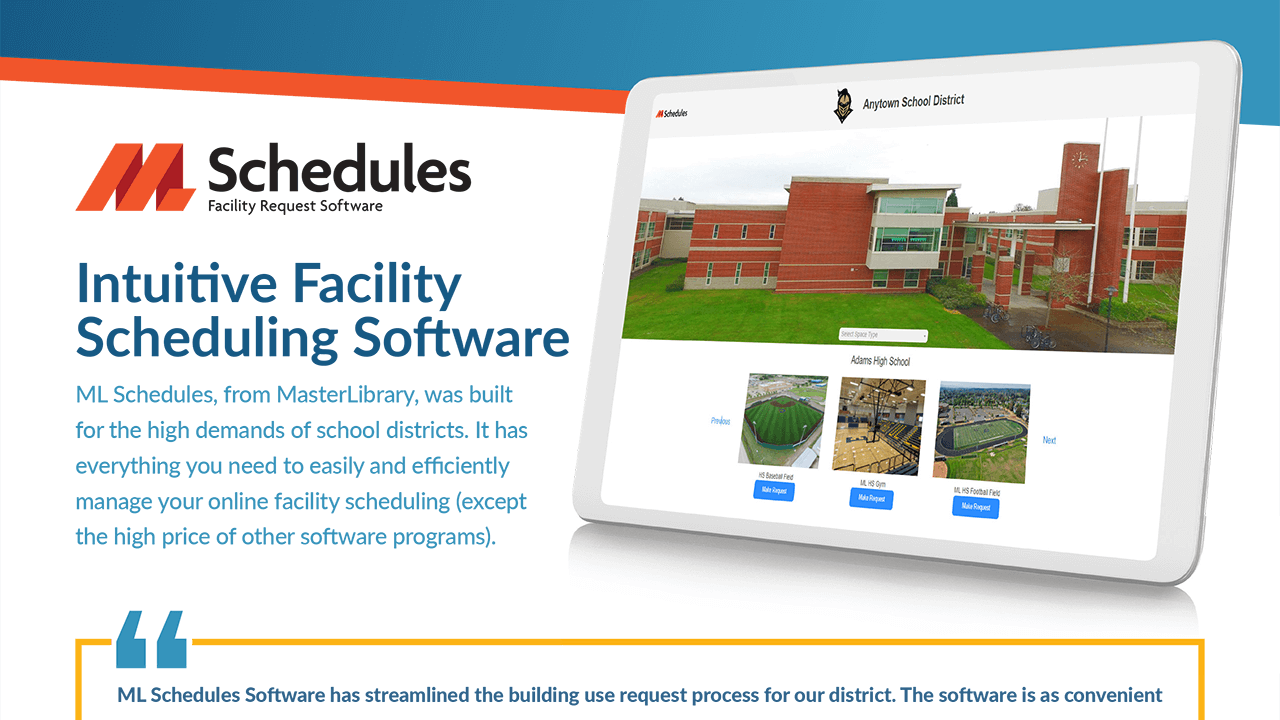 Facilities Schedules, from MasterLibrary, was built for the high demands of school districts. It has everything you need to easily and efficiently manage your online facility scheduling (except the high price of other software programs). Read about the many features Facilities Schedules offers.
